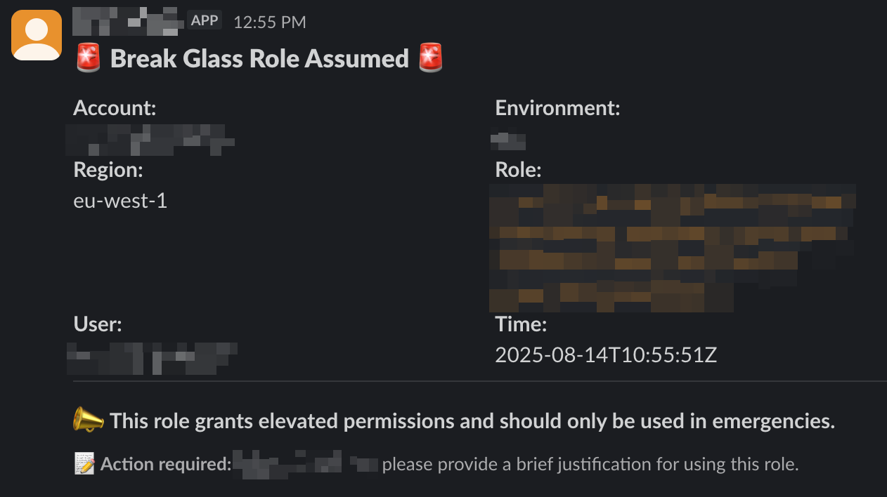 Now, whenever the "Break Glass" role is assumed, we will receive a Slack notification, it looks like this: